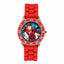 Marvel Iron Man kids watch with 33mm printed dial, silver metal casing, 3-hand analogue display, time-teaching feature, and red silicone strap with traditional buckle fastening. Supplied on a Marvel branded gift card.
