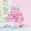 The pink dress has a colourful birthday-themed pattern all over and a beautiful blue bow around the waist.