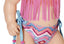 Contains: Frilly bikini with colourful pink and blue pattern, glittery pink jelly sandals and goggles with sweet Bruno the bear design.