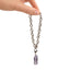 Yasmin wears a sleek chrome corset bodice with lilac straps, paired with matching bootcut pants, chrome boots, and a metallic choker. Chrome pins dazzle in her long hair, along with pearl earrings to finish the look.