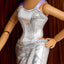 Yasmin wears a sleek chrome corset bodice with lilac straps, paired with matching bootcut pants, chrome boots, and a metallic choker. Chrome pins dazzle in her long hair, along with pearl earrings to finish the look.