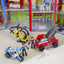 The included 26-piece accessory kit features a police motorcycle, fire truck, fire dog and more. Land the helicopter on the helipad on the rooftop.
