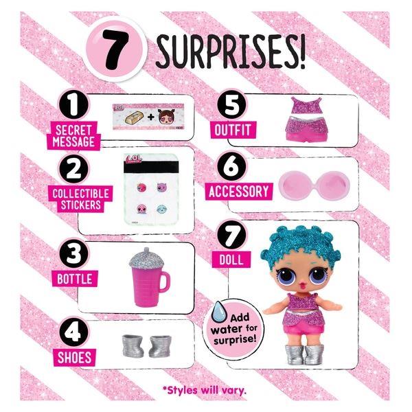Glitter Series includes glitterized versions of all your favourite L.O.L. Surprise! dolls. Feed your L.O.L. Surprise! Dolls with the water bottle or bathe them to find out if they cry, spit, tinkle, or colour change!