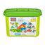 Your little builder can get inspired by the included building cards with simple instructions to build dinosaurs, robots, crocodiles, or just use the different coloured and shaped blocks to dream up endless tales! Wander the featured little boy and the dog figurine on its wheelbase to create moveable "tales." When playtime is over, tidy up is quick and easy with the sturdy plastic storage bin.