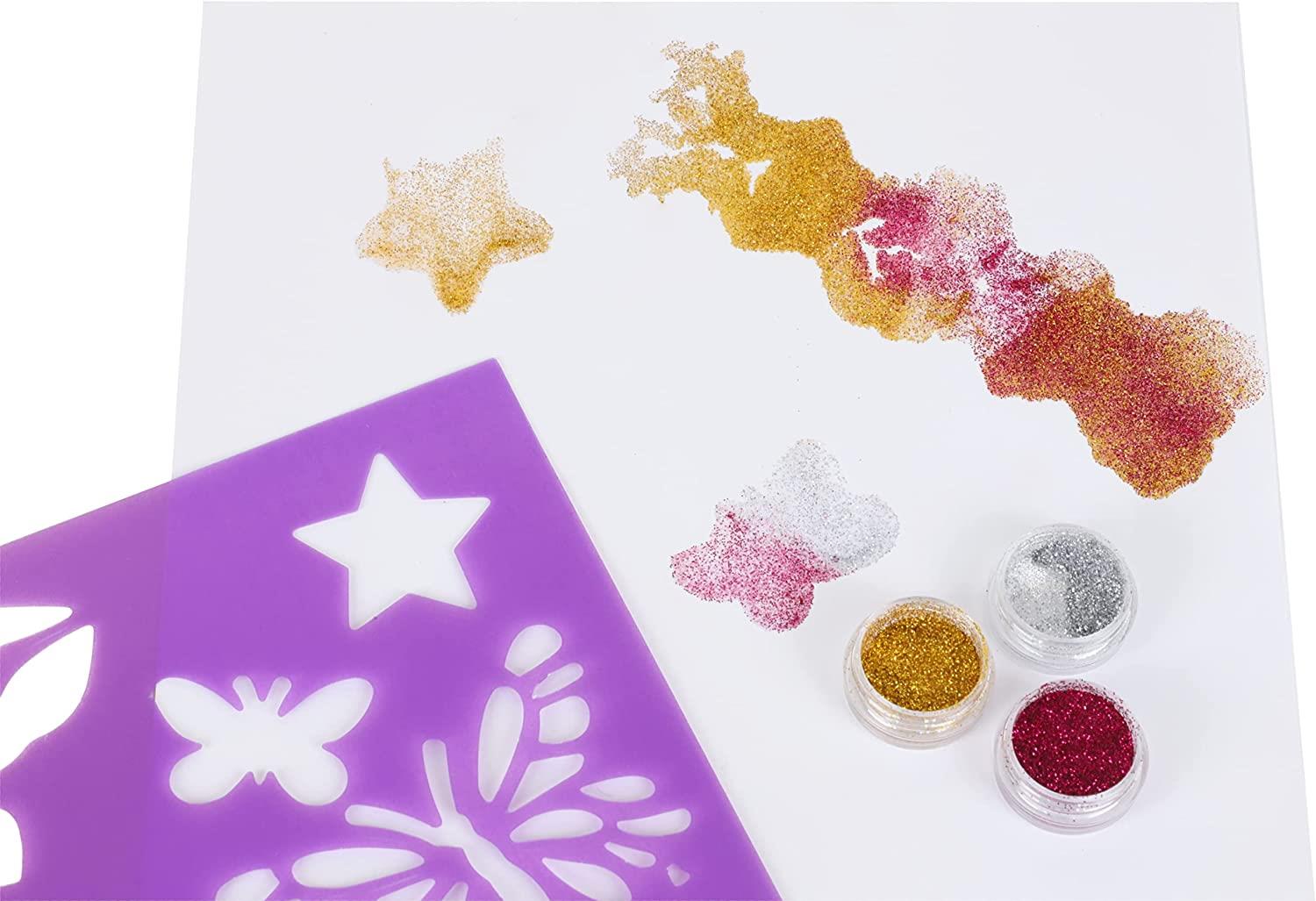 Contains: 3x Hair Chalk Markers (of different colours), 3x Containers with Glitter (of different colours), 1x Tube of Hair Gel, 1x Sheet of Gems, and 1x Sheet with Templates