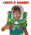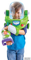 The helmet lights up and says phrases when you press the control panel's red button on the right side. Hear action sounds and lines like "I have a laser, and I will use it" and hear a jetpack engine roaring. Suit up with more costume gear with the Buzz Lightyear Disc Blaster and Wrist Communicator.